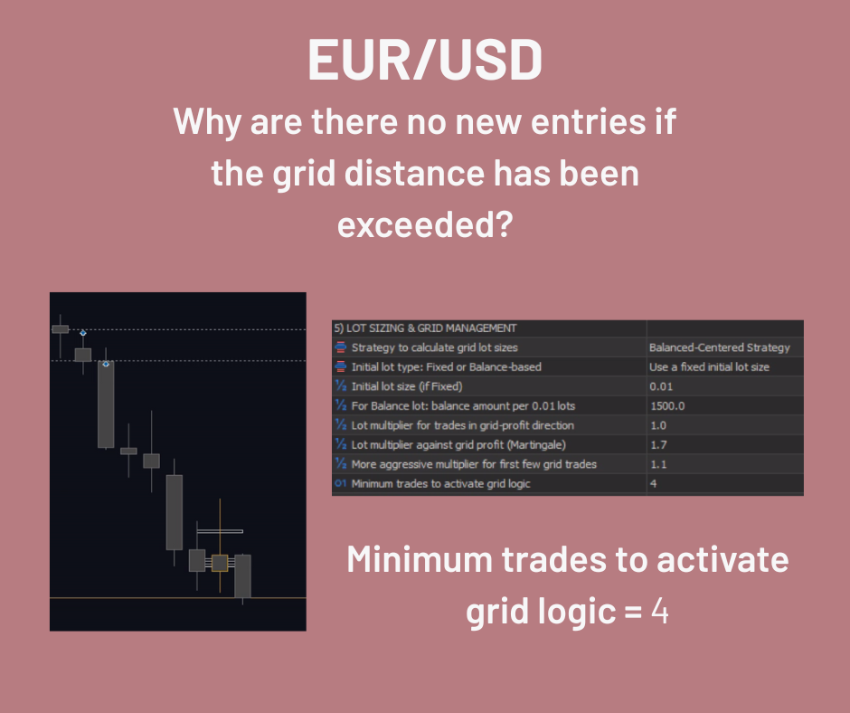 In this conservative set, the grid only activates after **four trades** have been opened by standard entry conditions (the base strategies). Until then, grid averaging is disabled.