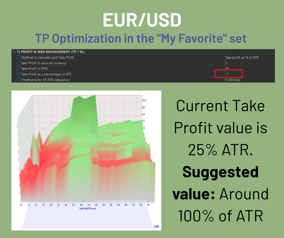 The original Take Profit was relatively low, and a significant portion of profit was being lost to swaps and commissions. It was set at 25% of the ATR. To refine it, I ran a 3D optimization (since 2D didn’t show the relationships clearly).