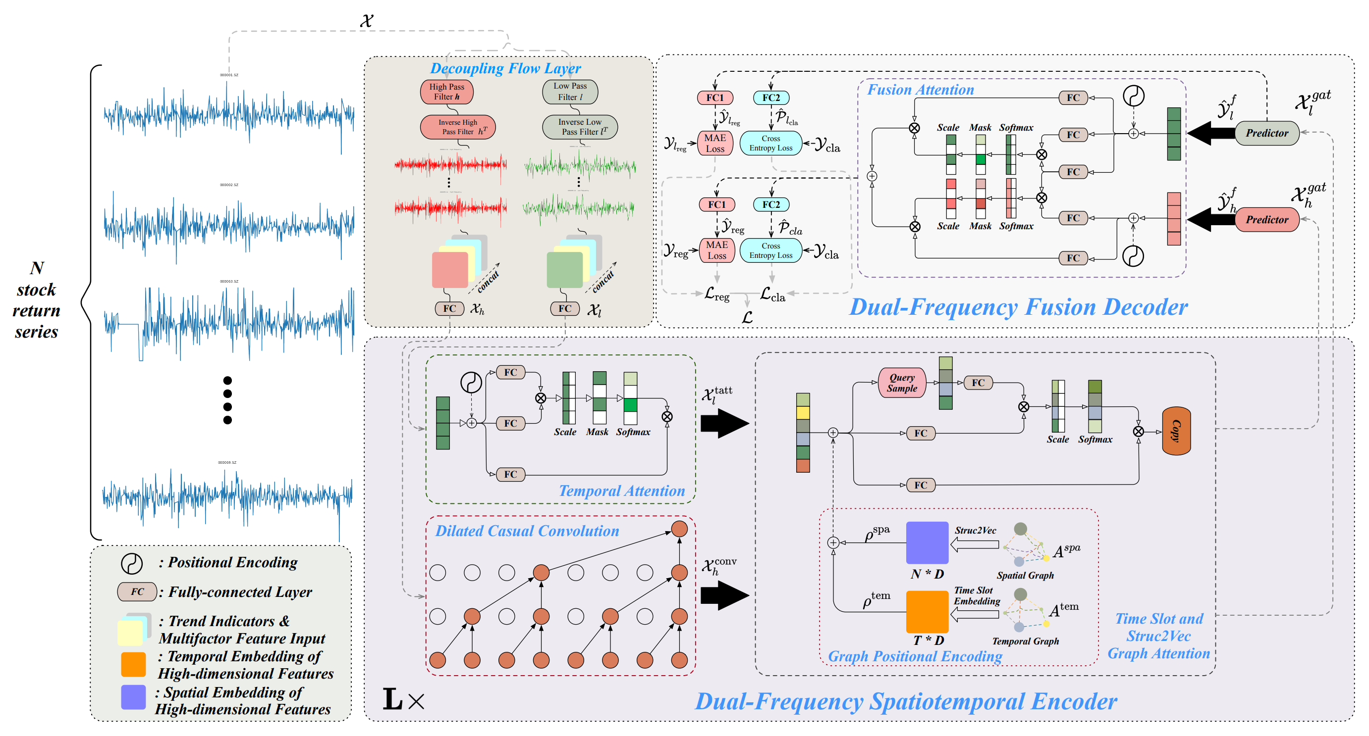 Nach der Zerlegung werden die Daten mit einem Zweifrequenz-Raum-Zeit-Kodierer verarbeitet. Dieses Modul kombiniert mehrere Untermodule und dient der Analyse der extrahierten Frequenzkomponenten sowie deren Abhängigkeiten untereinander. Niederfrequente Signale werden durch einen zeitlichen Aufmerksamkeitsmechanismus verarbeitet, der sich auf langfristige Trends und deren Entwicklung konzentriert. Hochfrequente Daten wiederum durchlaufen erweiterte kausale Faltungsschichten, die subtile Variationen und deren Dynamik erkennen. Die verarbeiteten Signale werden dann durch Graph-Attention-Module integriert, die räumlich-zeitliche Abhängigkeiten erfassen und die Beziehungen zwischen verschiedenen Vermögenswerten und Zeitintervallen widerspiegeln. Dieser Prozess führt zu mehrstufigen Graphendarstellungen, die in mehrdimensionale Einbettungen umgewandelt werden. Diese Einbettungen werden mithilfe von Additions- und Graph-Attention-Mechanismen zusammengeführt und bilden eine umfassende Darstellung der Daten für die anschließende Analyse.