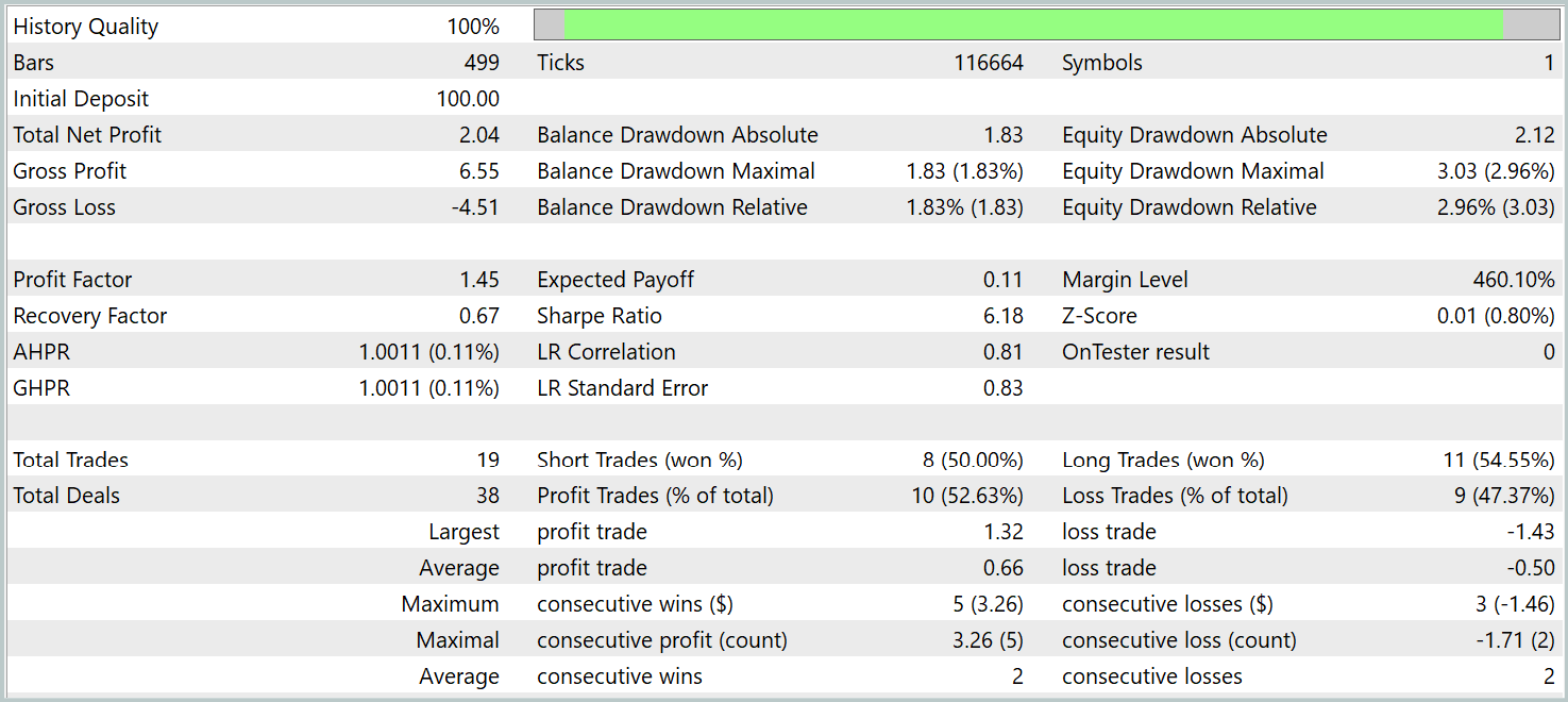 Während des Testzeitraums führte das Modell 19 Trades aus, von denen 10 mit Gewinn abgeschlossen wurden. Dies sind etwas mehr als 50 %. Aufgrund des höheren durchschnittlichen Gewinns pro gewonnenem Handel im Vergleich zu den verlorenen Positionen beendete das Modell den Testzeitraum jedoch mit einem Gesamtgewinn und erreichte einen Gewinnfaktor von 1,45.
