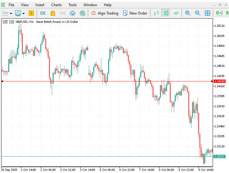 Beispiel: Manuelle Analyse der Marke von 1,34244 (GBP/USD H1, April 2025 bis Oktober 2025)