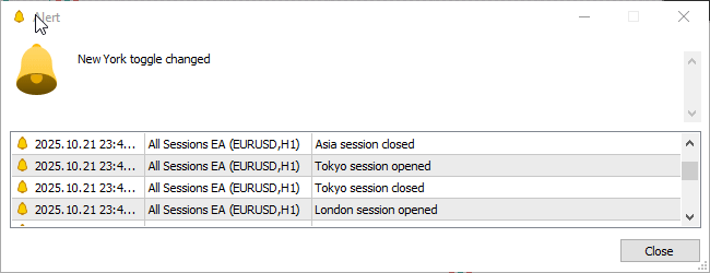 void CheckSessionAlerts() { datetime now = TimeCurrent(), base = Day0(now); datetime asO = MakeTime(base, AsiaStart), asC = MakeTime(base, AsiaEnd); datetime lnO = MakeTime(base, LondonStart), lnC = MakeTime(base, LondonEnd); datetime nyO = MakeTime(base, NewYorkStart),nyC = MakeTime(base, NewYorkEnd); if(!openedAsia && now >= asO){ openedAsia = true; UpdateTicker("Asia session opened"); } if(!closedAsia && now >= asC){ closedAsia = true; UpdateTicker("Asia session closed"); } if(!openedLondon&& now >= lnO){ openedLondon= true; UpdateTicker("London session opened");} if(!closedLondon&& now >= lnC){ closedLondon= true; UpdateTicker("London session closed");} if(!openedNewYork&& now >= nyO){openedNewYork=true; UpdateTicker("New York session opened");} if(!closedNewYork&& now >= nyC){closedNewYork=true; UpdateTicker("New York session closed");} }
