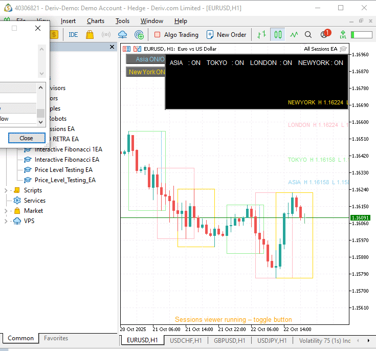 Das obige Chart zeigt den All Sessions EA, der auf dem Chart des Demo Accounts des Brokers Deriv (EURUSD H1) läuft. Bei diesem Test wurden alle vier Sitzungen – Asien, Tokio, London und New York – gleichzeitig aktiviert. Jedes Rechteck wird in der ihm zugewiesenen Farbe angezeigt: Himmelblau für Asien, Hellgrün für Tokio, Hellrosa für London und Gold für New York. In der oberen linken Ecke bestätigen die Schaltflächen („Asia ON/OFF“, „Tokyo ON/OFF“ usw.), dass die interaktive Schnittstelle in der Umgebung des MetaTrader 5 korrekt geladen wurde. Wenn Sie auf eine Schaltfläche klicken, wird die entsprechende Sitzungsbox sofort ausgeblendet oder neu gezeichnet, was zeigt, dass die Funktionen für die Ereignisbehandlung und das Neuzeichnen unter der Infrastruktur dieses Brokers voll ansprechbar sind. Die schwarze Informationstafel oben rechts zeigt genau den aktuellen Stand aller Sitzungen an: