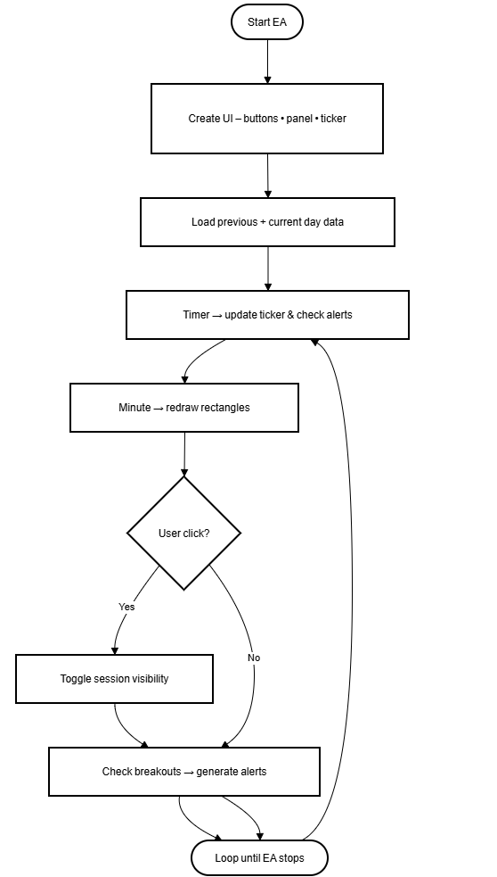 Sobald die Schnittstelle eingerichtet ist, braucht der EA die Logik, mit der er denkt, reagiert und mit dem realen Markt synchronisiert bleibt. Ziel ist es, den Händlern zu ermöglichen, in Echtzeit zu beobachten, wie sich der globale Handelstag entwickelt – von Asien über Tokio und London bis nach New York – während der EA automatisch jede Sitzung zeichnet, Aktivitäten meldet und auf Ausbruchschancen aufmerksam macht. Dieser Abschnitt geht jeden Teil dieser Logik im Detail durch und zeigt die entsprechenden MQL5-Implementierungen.