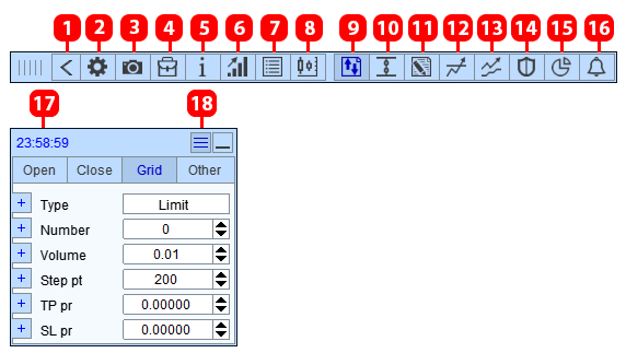 | 7 | Order volumen: Volume / Number - das berechnete Volumen der Master Order wird gleichmäßig auf die Orders verteilt (bei Bedarf wird die Lotgröße normalisiert). | Die angegebene Anzahl an Grid-Orders beträgt 4, Das berechnete Volumen beträgt 1,00, Wenn Sie auf die Schaltfläche klicken, werden 5 Orders geöffnet. Jede Order hat ein Volumen von 0,20 Lots (1,00/5). |