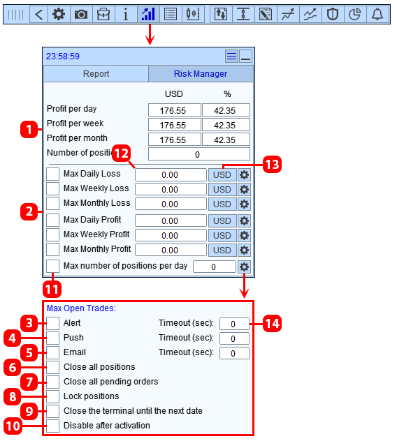 - Feld zur Eingabe des Gewinn- (Verlust-)Betrags, bei dessen Überschreitung die festgelegte Risikomanager-Aktion aktiviert wird. In jedes Feld können Sie entweder einen positiven oder einen negativen Wert eingeben (mit einem Minuszeichen) und der eingegebene Wert wird unverändert verwendet.