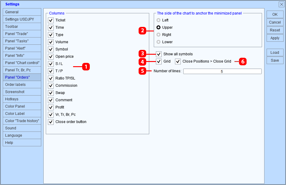 - Anzahl der Zeilen mit Orders, die im Panel angezeigt werden.