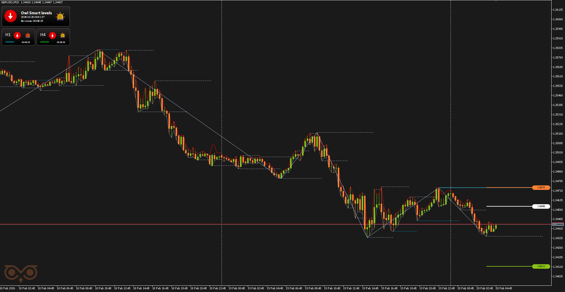 Der dritte Trade auf das Währungspaar GBPUSD wurde am 20. Februar 2026 nach einem weiteren Verkaufssignal von Owl Smart Levels eröffnet. Zum Zeitpunkt des Einstiegs bewegte sich der Markt weiterhin nach unten, sodass der Trade in Richtung des aktuellen Trends eröffnet wurde – mit voreingestellten Einstiegs-, Stop-Loss- und Take-Profit-Niveaus.