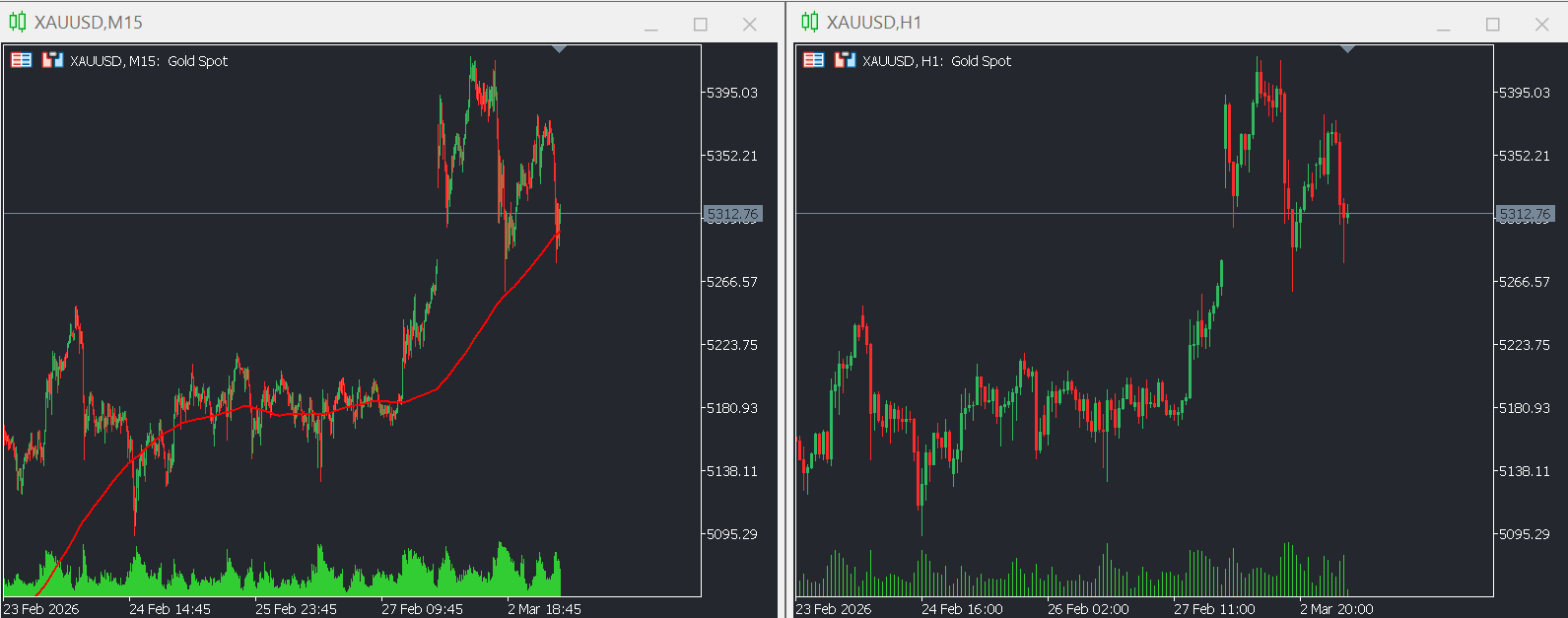 Der heutige Handel war von extremer Volatilität geprägt, wobei die Preise bei $5.277,90 eröffneten und ein Hoch von $5.393,34 erreichten. Laut aktueller Marktanalyse gewann Gold am Montag mehr als 1% und stieg auf über $5.350 pro Unze, das höchste Niveau seit über einem Monat, angetrieben durch intensivierte Nachfrage nach sicheren Anlagen.