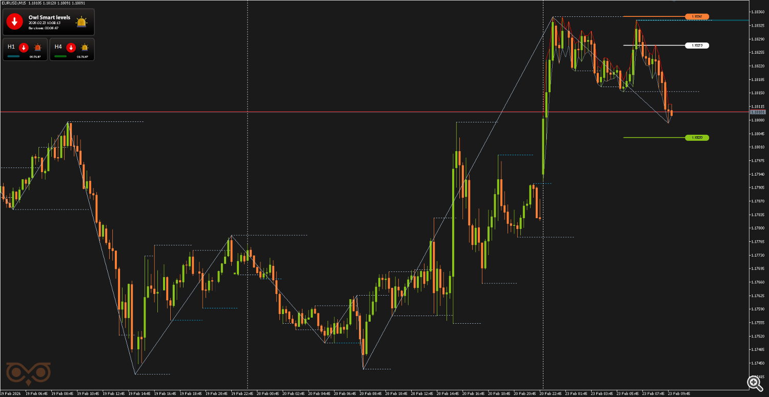 Der erste Trade auf das Währungspaar EURUSD wurde am 23. Februar 2026 eröffnet, nachdem der Owl Smart Levels-Indikator ein Verkaufssignal gegeben hatte. Zum Zeitpunkt der Signalerzeugung zeigte der Markt bereits einen Abwärtstrend, sodass der Trade für einen Verkauf eröffnet wurde.