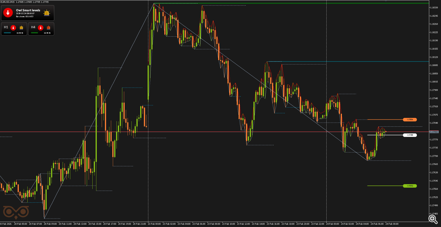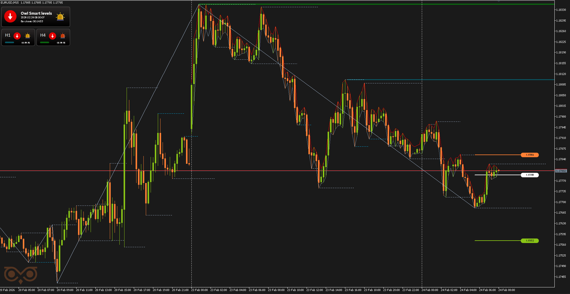 Der zweite Trade auf das Währungspaar EURUSD wurde am 24. Februar 2026 eröffnet, nachdem der Owl Smart Levels-Indikator ein Verkaufssignal gegeben hatte.