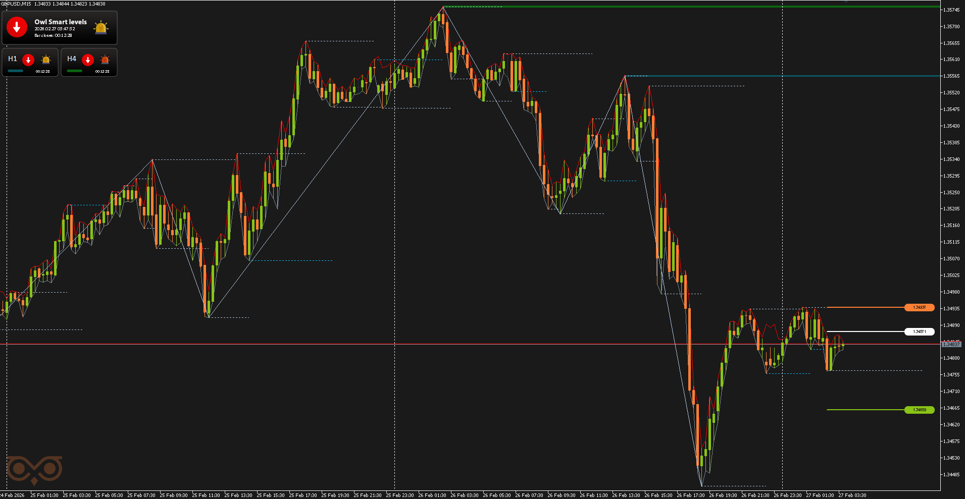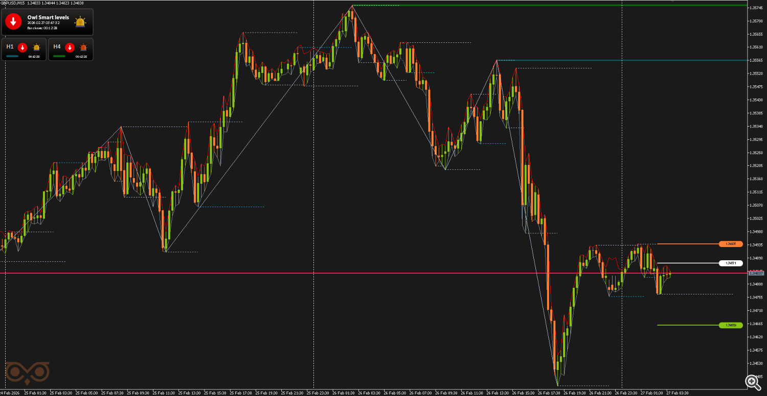 Der Trade auf GBPUSD wurde am 27. Februar 2026 eröffnet, nachdem der Owl Smart Levels-Indikator ein Verkaufssignal generiert hatte. Nach der Eröffnung setzte sich die Abwärtsbewegung des Kurses nicht fort und es kam zu einem Aufwärts-Pullback, der das Stop-Loss-Niveau erreichte. Infolgedessen wurde die Position mit einem vordefinierten Verlust geschlossen, was vollständig den Risikomanagementregeln des Systems entspricht.