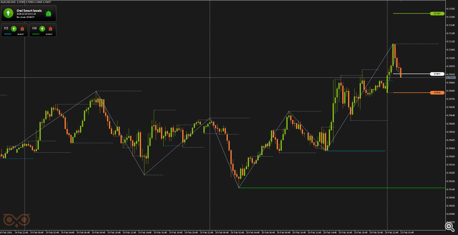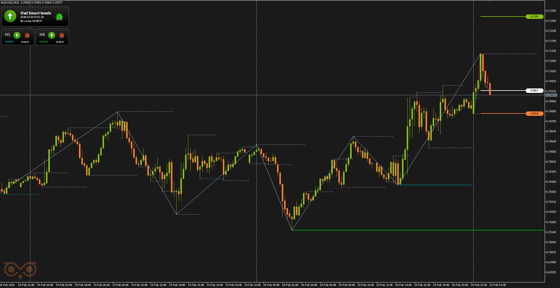 Für das Währungspaar AUDUSD gab es in der Berichtswoche ein Signal des Indikators Owl Smart Levels. Der Handel wurde am 23. Februar 2026 eröffnet, nachdem ein Kaufsignal generiert worden war.
