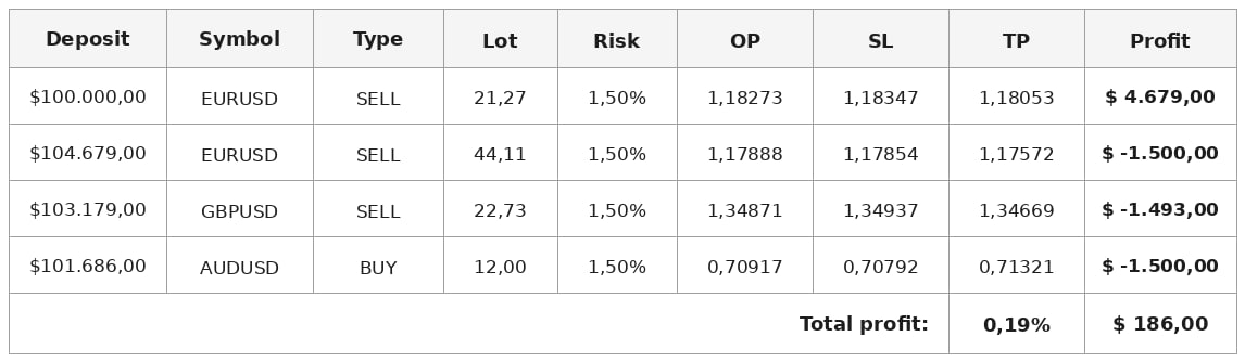 Infolgedessen wurde die Position bei Stop Loss mit einem vorab festgelegten Verlust geschlossen. Das Risiko des Handels betrug 1,5 % der Einlage, was den festgelegten Kapitalmanagementregeln entspricht.