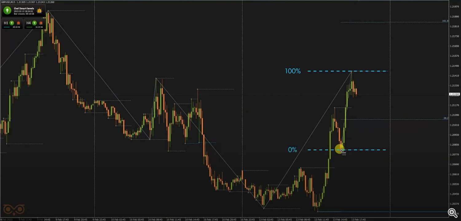 Im Owl Smart Levels-System werden Korrekturen verwendet, um Einstiegspunkte über das Fibonacci-Raster zu finden.