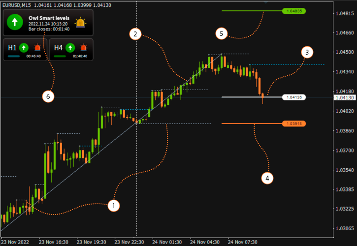 Der erste Schritt besteht darin, die Funktionsweise des Systems zu verstehen. Der Indikator Owl Smart Levels ist keine Sammlung zufälliger Signale — er basiert auf grundlegenden Marktprinzipien: Trend, Marktstruktur und Korrekturen.