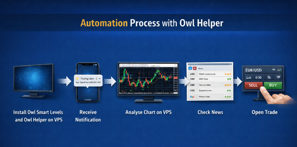 In der Praxis sieht es so aus: Owl Smart Levels und Owl Helper werden auf einem VPS-Server installiert, danach werden Benachrichtigungen eingerichtet. Wenn ein Signal erscheint, loggt sich der Trader in den VPS ein, bewertet die Marktsituation, prüft die Qualität des Setups, analysiert die Nachrichten und trifft erst dann die Entscheidung, einen Trade zu eröffnen.