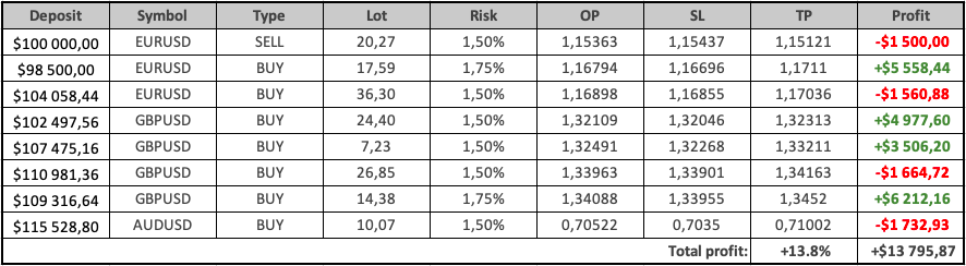 Insgesamt wurden 8 Trades eröffnet. Davon endeten 4 mit Gewinn und 4 wurden per StopLoss geschlossen. Das Gesamtergebnis der Woche beträgt +$13 795.87, was einer Performance von +13.80% auf das Konto entspricht.