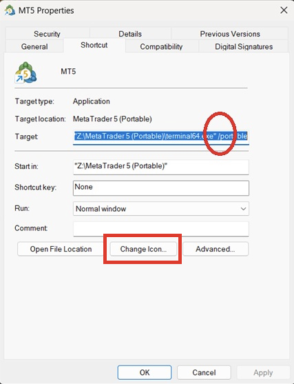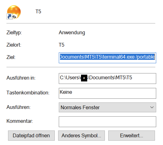 Das bedeutet in Kurzfassung: MT5 startet bei mir IMMER im Rohzustand, wenn ich über die /portable-Verknüpfung starte.Das einzig Abweichende was ich noch finden kann: der Pfad der Verknüpfung enthält bei mir noch Gänsefüßchen: "C:\MetaTrader 5\terminal64.exe" /portable