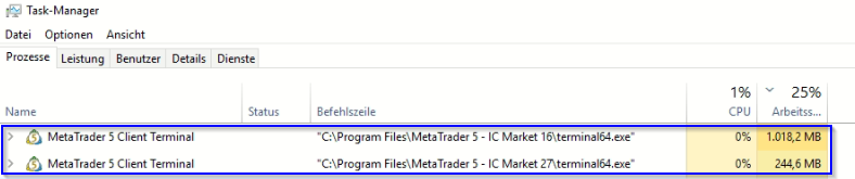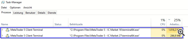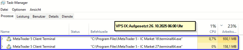 wie kann es sein, dass auf einem VPS mit zwei verschiedenen MT5-Konten mit identischen Konfigurationen ein Konto 5-mal mehr RAM/CPU benötigt?