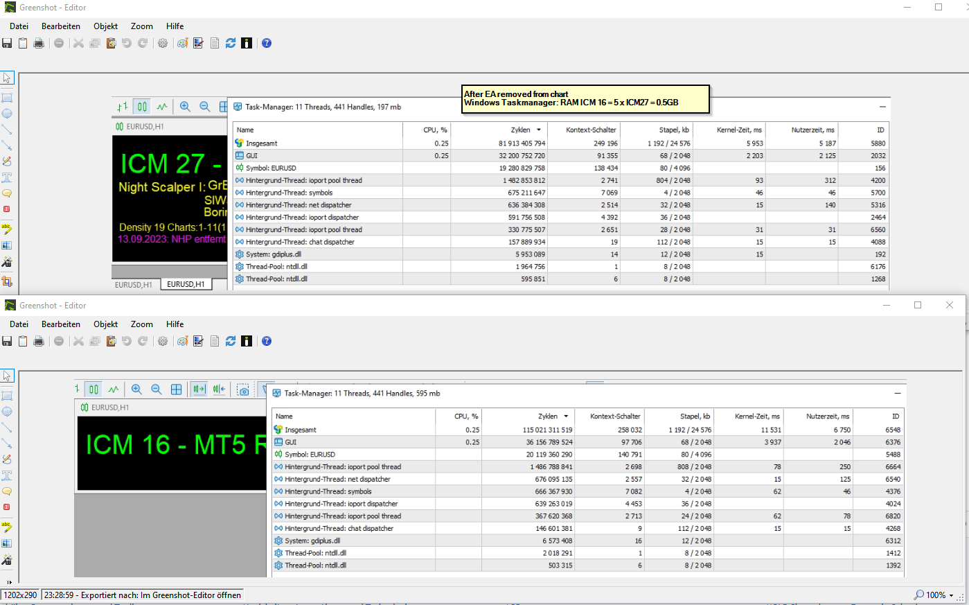 Da jetzt keine Handelszeiten sind, verwenden alle die gleiche Menge an RAM/CPU, sodass ich dieses Wochenende nicht mit „ProcessExplorer” oder „RAMMap” überprüfen kann.