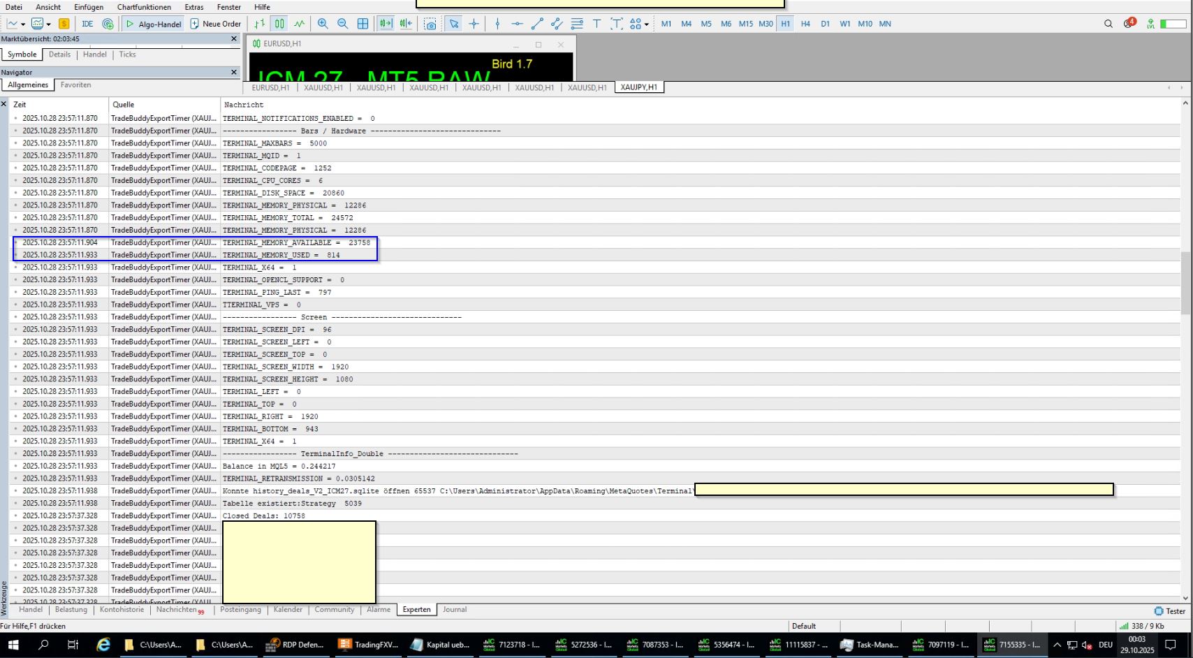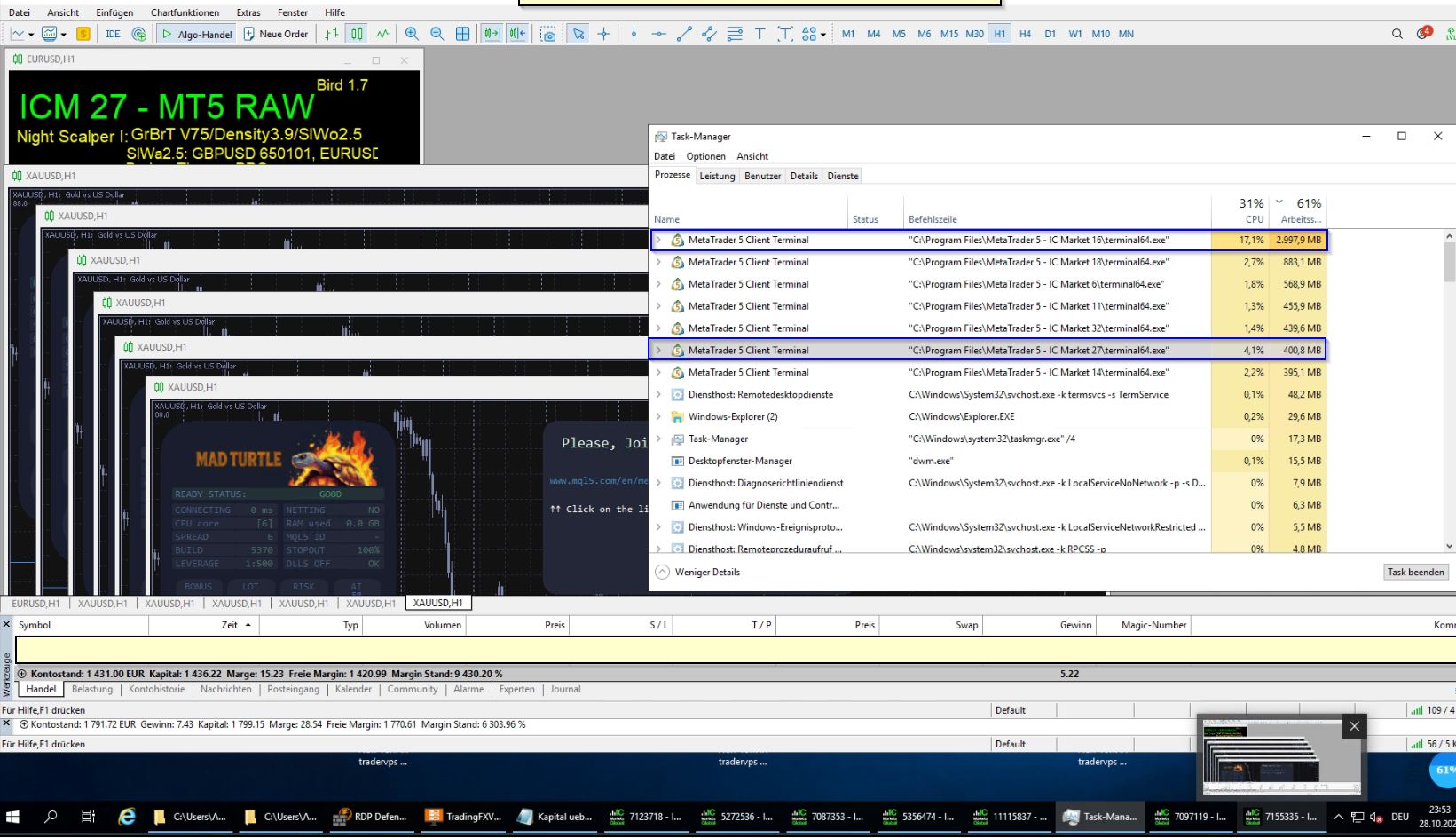 Zum Test: Habe beide Accounts, ICM16 und ICM27, auf identischer VPS mit identischen 6 EA-Charts laufen, siehe Taskmanager. Beide nehmen sich unterschiedlich viel RAM und CPU.