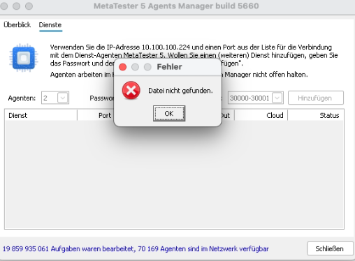 Mac Mini M4 können bei MT5 im "MetaTester 5 Agents Manager build 5727" keine Agenten mehr hinzugefügt/gelöscht werden, es fehlen auch 2 Reiter - Seite 2