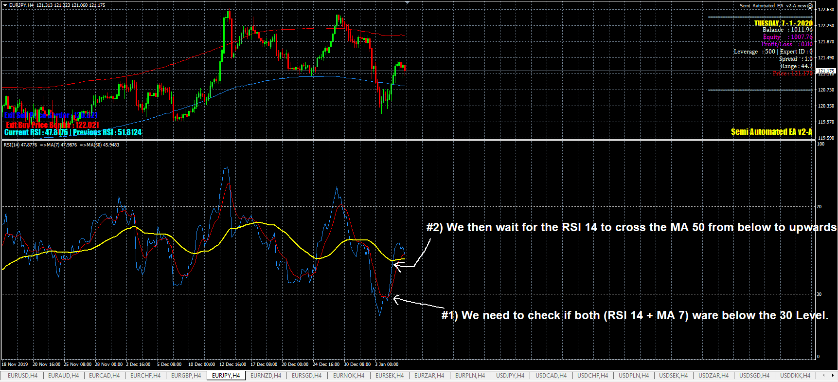 #1) We check if RSI 14 + MA 7 (of the RSI window) ware below Level 30