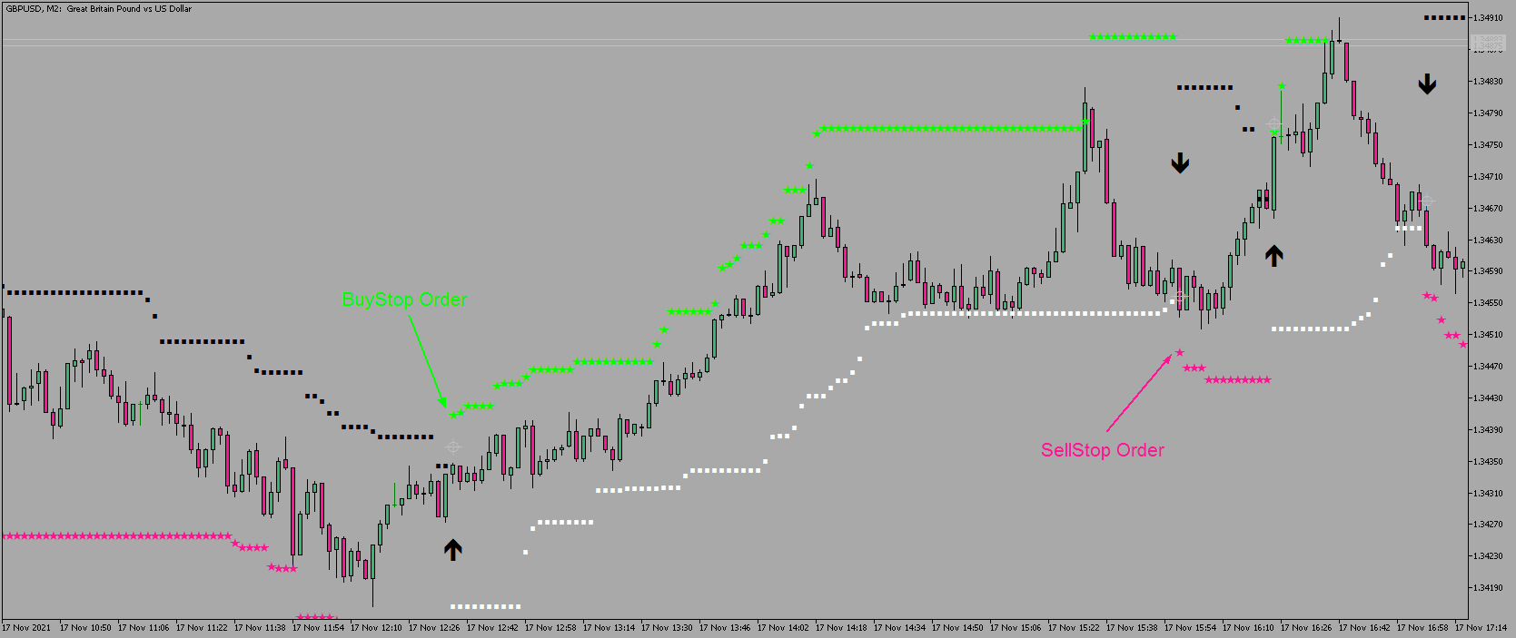 Nach dem Erscheinen eines Sell-Signales soll eine SellStop Order genau auf den ersten erscheinenden roten Stern platziert werden. Eventuell auf diesem Chart noch vorhandene Pending Orders sind vorher zu löschen.