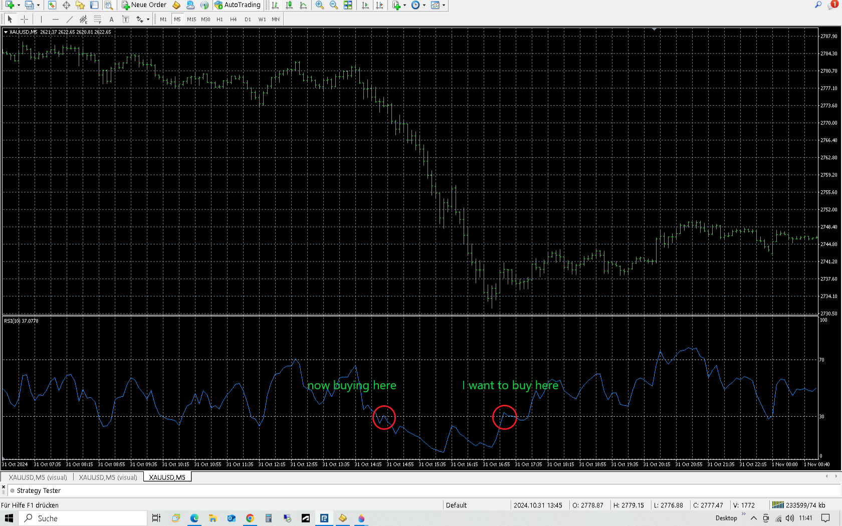 Wenn der RSI auf 30 und dann weiter heruntergeht soll Buy erst bei Kreuzung der 30er Linie von unten nach oben geöffnet werden.