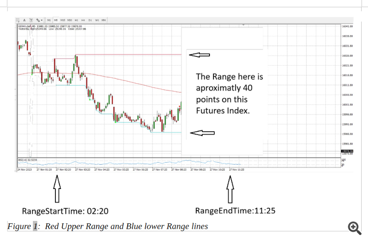 The user specified time period ‘RangeStartTime’ to ‘RangeEndTime’ is scanned to identify the candle range highest and lowest values (wicks included). Horizontal lines are drawn around this range. The colour of the lines and thickness of the lines can be changed by the user.