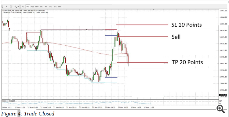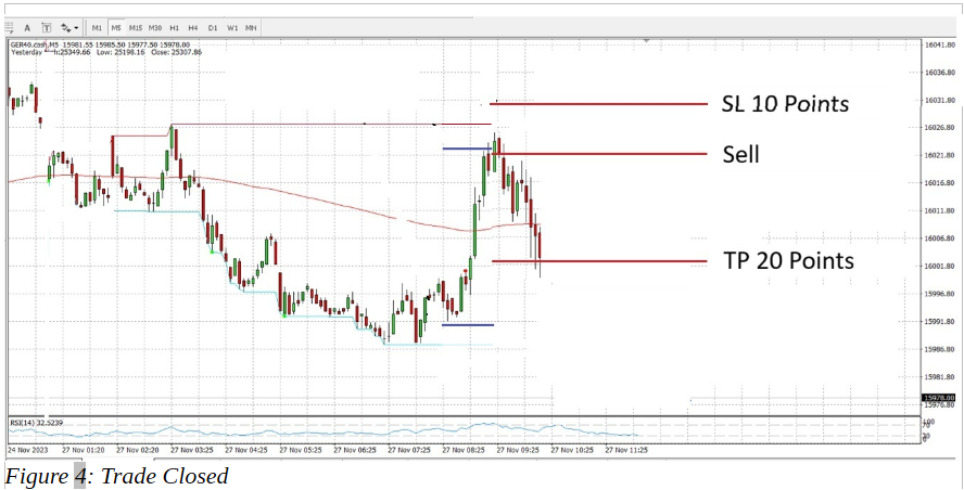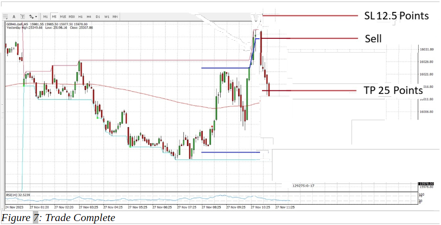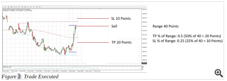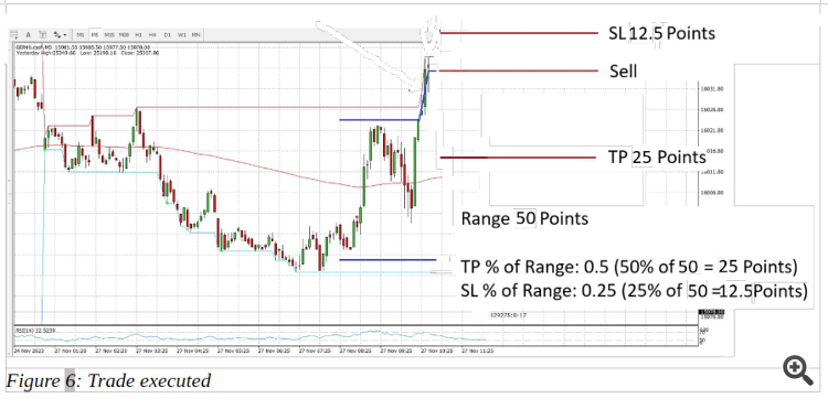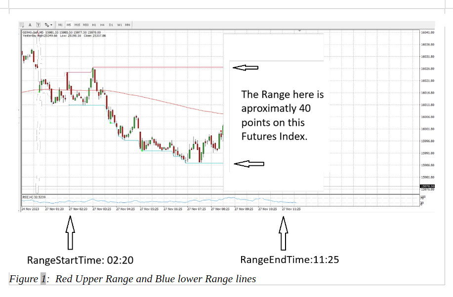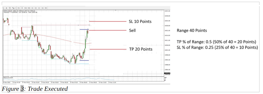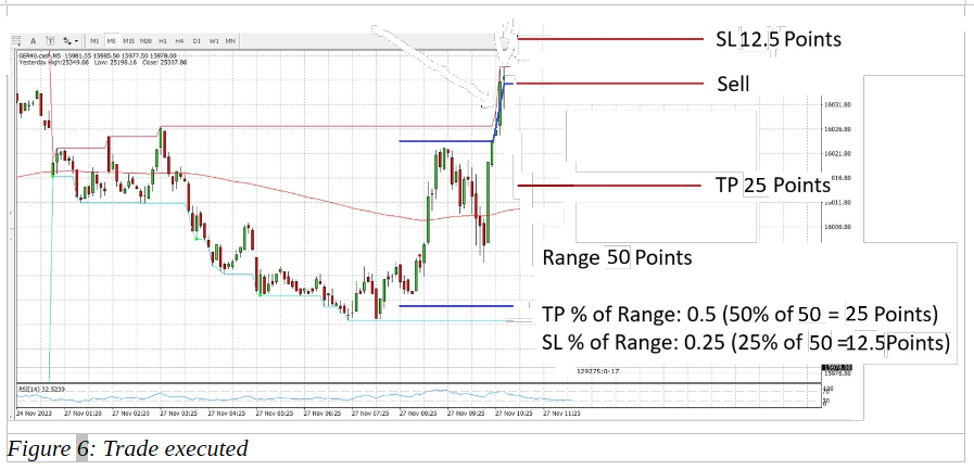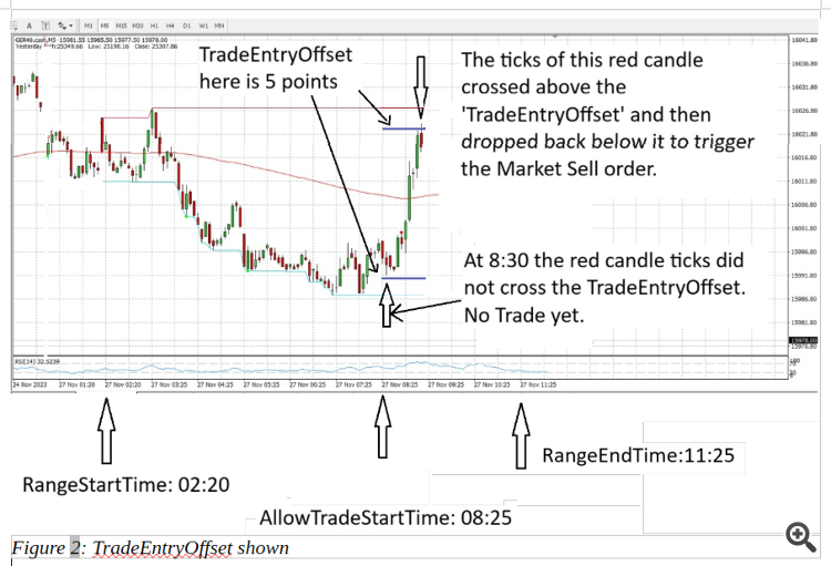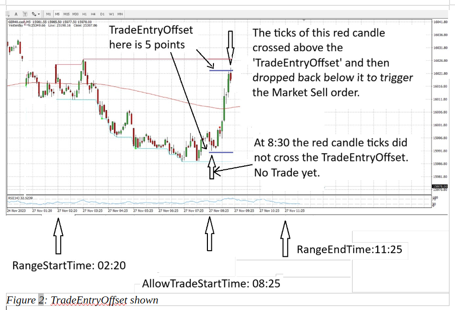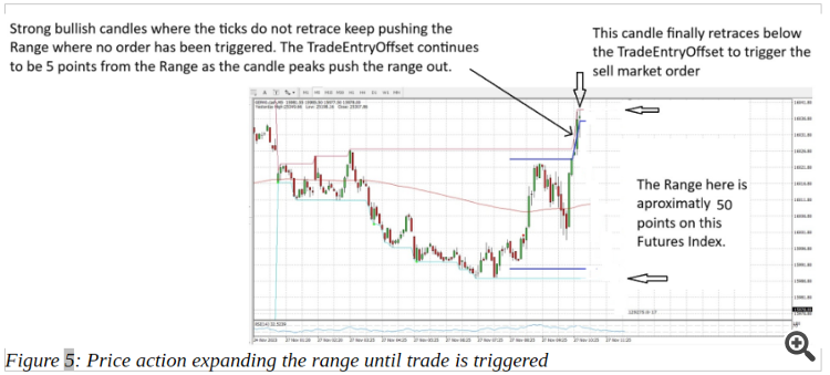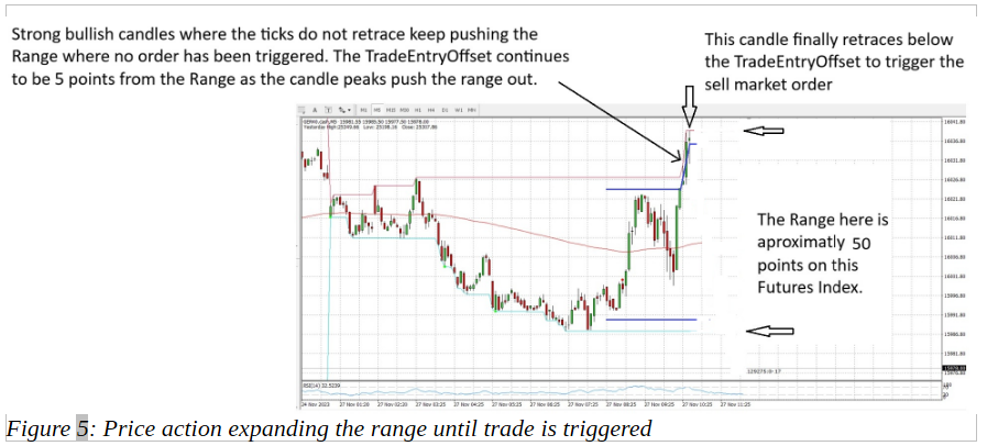 The ‘AllowTradeStartTime’ may be initiated when the ‘RangeEndTime’ has not yet concluded. This will enable the range to continue to be formed by steadily trending candles and only when one candle retraces inward of the ‘TradeEntryOffset’ will a trade then be placed. Figure 5 demonstrates this principal below. The range is monitored until moment order is placed to populate SL and TP values, and lot size if correlated to % balance or monetary value.