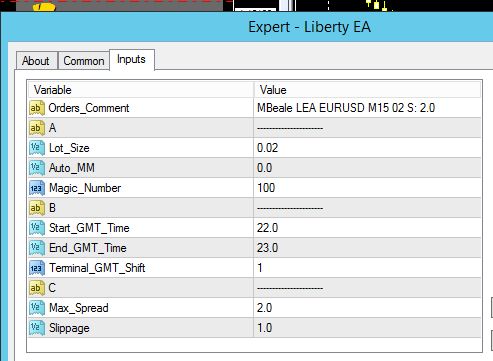 I just purchased the EA and have not had any trades yet. I noticed that the text in the properties dialog box About tab shows the pairs for the MilkyWay EA not the Liberty EA. The text in the About tab reads: