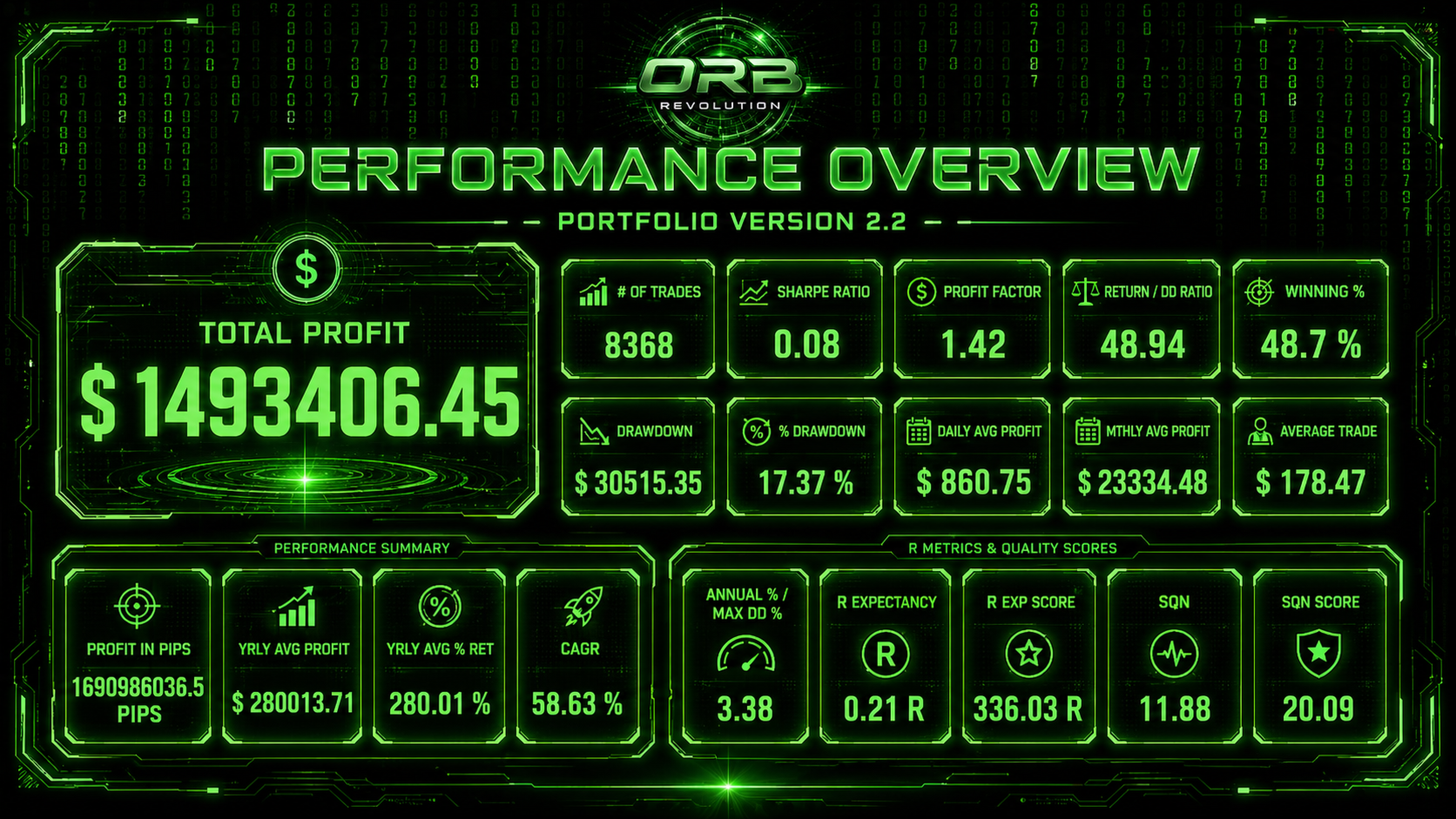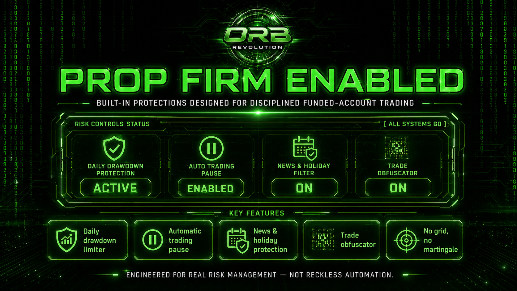 ORB Revolution ist ein professioneller Opening Range Breakout (ORB) Expert Advisor für MetaTrader 5, entwickelt für diszipliniertes, risikokontrolliertes automatisiertes Trading. Nach institutionellen Standards entwickelt, legt dieses System besonderen Wert auf Kapitalschutz, wiederholbare Ausführung und eine transparente Entscheidungslogik — ideal für ernsthafte Trader und Teilnehmer von Prop-Firm Challenges. ORB Revolution unterstützt vollständig NETTING- und HEDGING-Konten und enthält integrierte Schutzmechanismen, um Overtrading, übermäßiges Risiko und Regelverstöße zu vermeiden, die häufig zur Disqualifikation bei Prop-Firmen führen.
