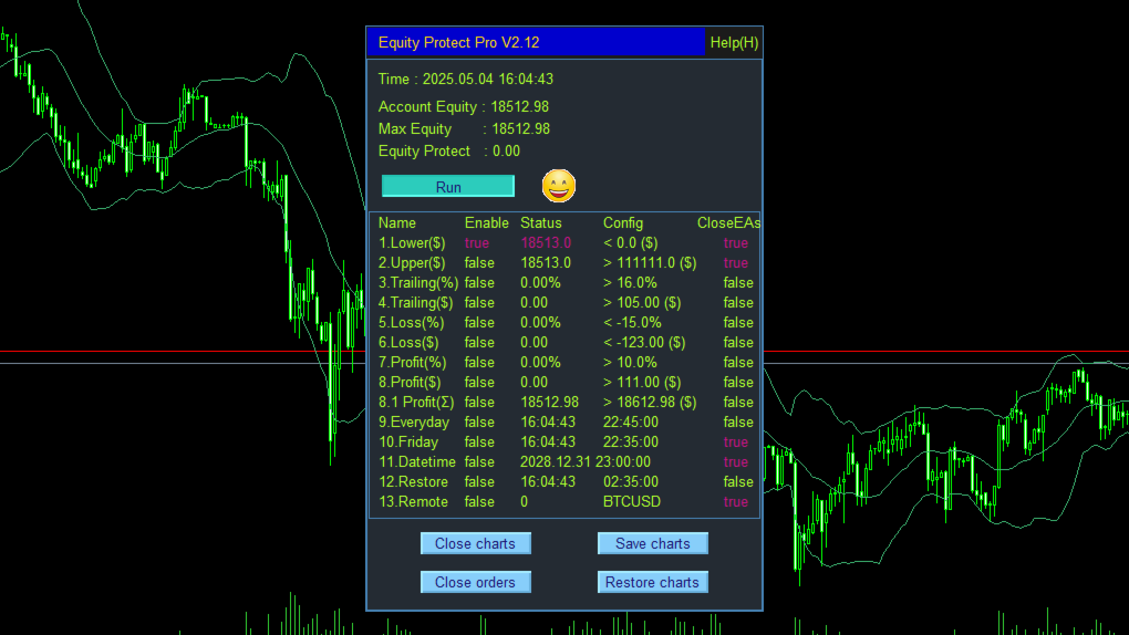- Equity Lower Limit: Wenn das Kontoguthaben unter diesen voreingestellten Wert fällt, wird der Schutz sofort ausgelöst. Sehr empfehlenswert, geeignet für die meisten Trader, um signifikante Verluste effektiv zu verhindern.