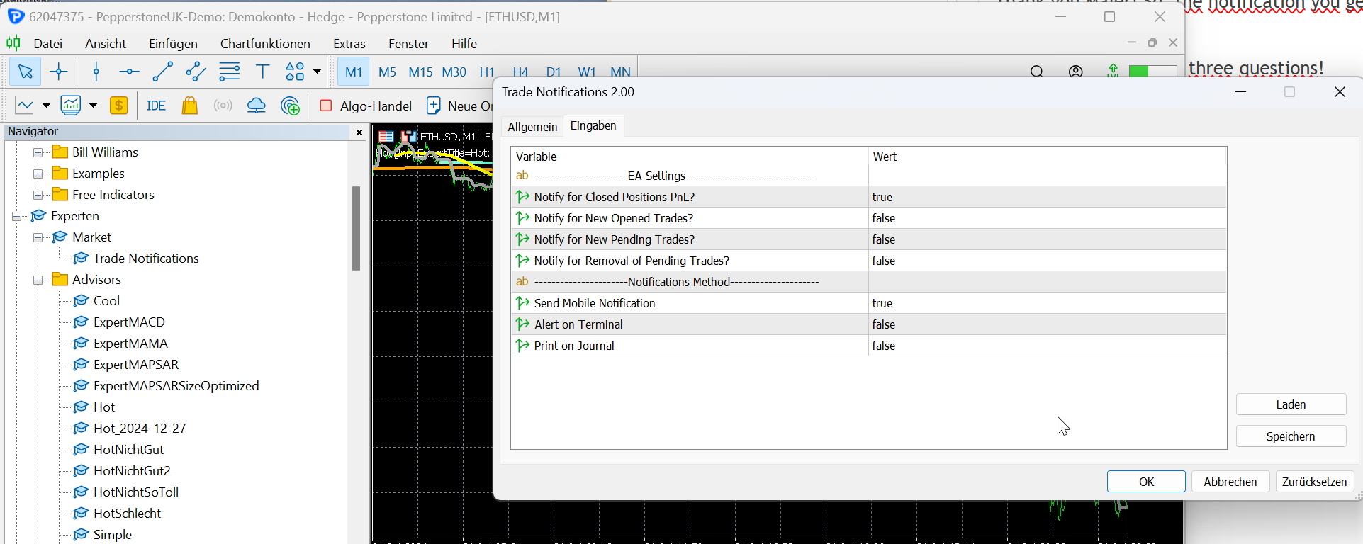 So, did you get any kind of message form the Trade Notifications but not trade-related notifications? As long as the EA is running in a window, no need to re-initialize it. I don't think the terminal from Pepperstone plays a role, you can use any MT5 from any broker and connect to any broker account.. I think you need to trial and error with different setups to understand the root of the problem, as the initial setup is quite easy. It might be a dumb question, but I guess you've turned "true" the parameters you want in the Input tab of the EA, right?