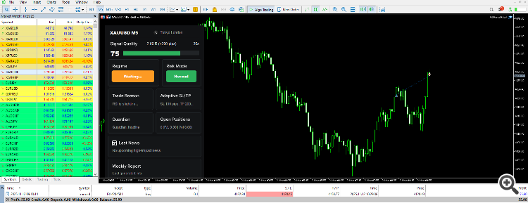 Automatic TP/SL/TS Adjustment. The robot automatically adjusts Take Profit, Stop Loss, and Trailing Stop levels to match market volatility, all fully managed by Artificial intelligence.