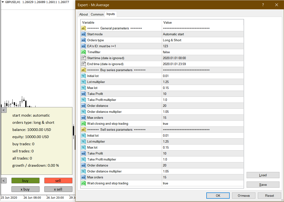 This EA requires a balance of parameters. For example, by increasing the volume multiplier, you can reduce the price rollback needed to bring a series of deals to profit, but at the same time, the total volume of a series of deals is growing. Reducing the volume of the multiplier, we reduce the load on the deposit, but to close the series in profit, a more significant rollback of the price may be required.