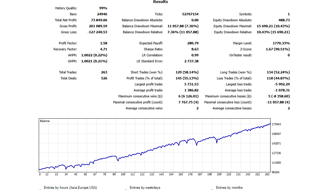It uses a Stop loss and fixed take profit of 75 points. It will place order 15 min after the US market open. Works on 15 Minute chart.