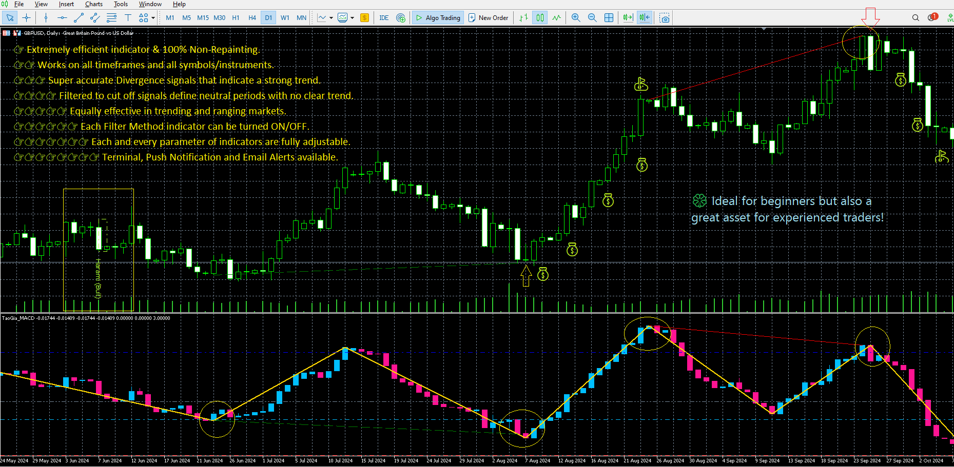 Warnungen und Visualisierung: Der Indikator bietet visuelle Warnungen (Pfeile und rechteckige Hervorhebungen) sowohl für Divergenzen als auch für Candlestick-Muster. Er generiert auch Warnungen (Ton, E-Mail, Push-Benachrichtigungen), um Händler über potenzielle Handelsmöglichkeiten zu informieren. Divergenzen werden sowohl auf dem Hauptchart als auch im Indikatorfenster mit Trendlinien markiert.