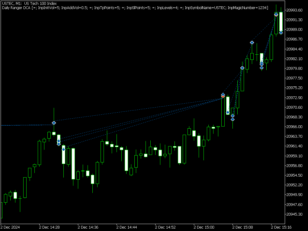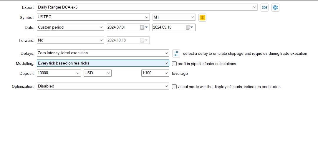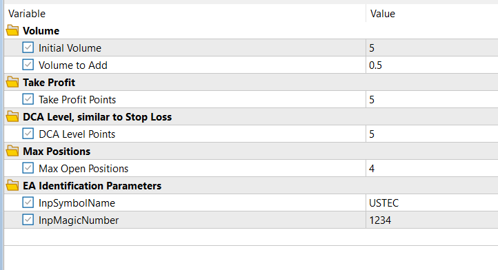 Eine Optimierung kann durchgeführt werden, um die besten Werte für TP-Punkte und DCA-Level zu finden, die für die Spezifikation Ihres Brokers geeignet sind.