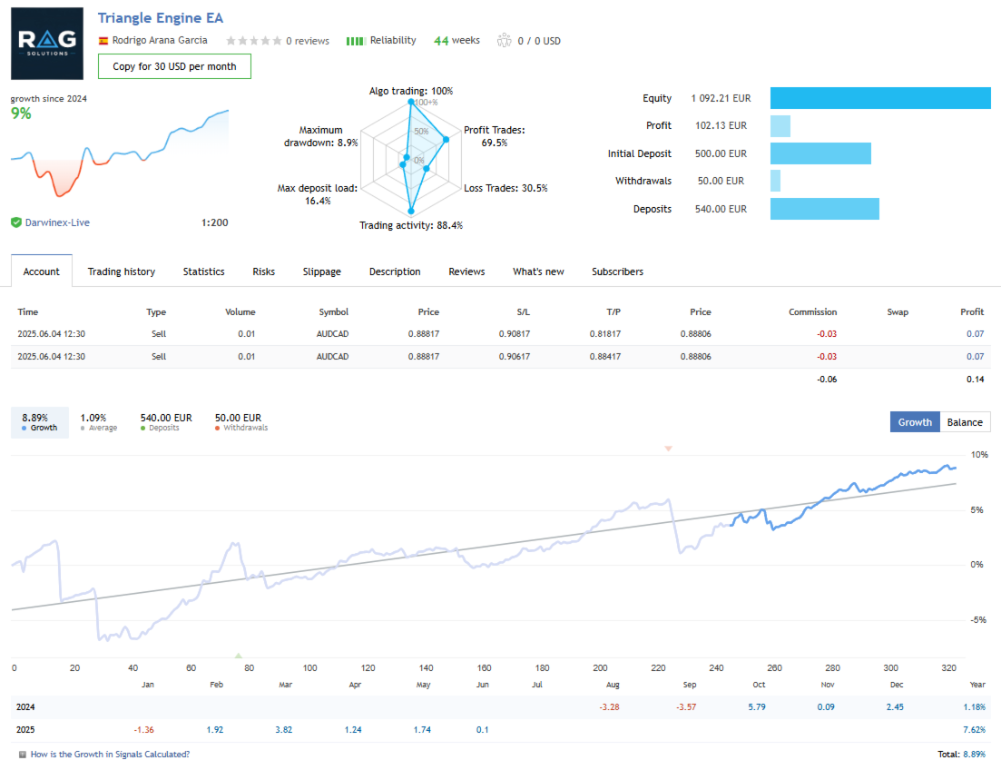 Triangle Engine wurde entwickelt, um das Kapital von Menschen auf einfache und zugängliche Weise zu vermehren. Wenn Sie genug von Algorithmen haben, die im Backtesting großartig zu funktionieren scheinen, aber dann in Live-Konten nicht mehr genauso gut funktionieren, dann ist Triangle Engine die Lösung, nach der Sie suchen. Triangle Engine ist ein fortschrittlicher Algorithmus, der sorgfältig entwickelt wurde, um die inhärenten Schwachstellen von AUDCAD zu identifizieren und auszunutzen. Mithilfe eines ausgeklügelten Satzes von Metriken und verschiedenen Strategien führt dieses System eine eingehende Echtzeitanalyse der Marktdynamik durch und bewertet dabei kritische Faktoren wie Volatilität, sich abzeichnende Trends und historische Muster.