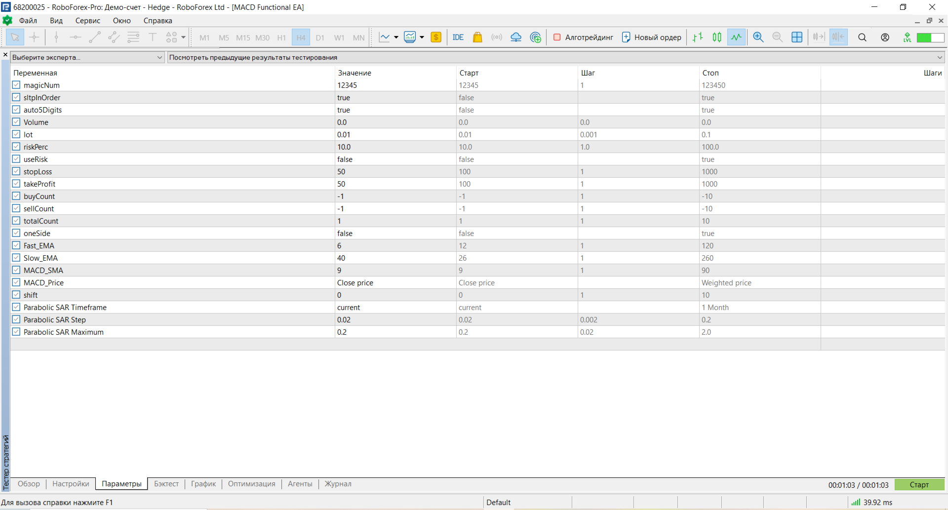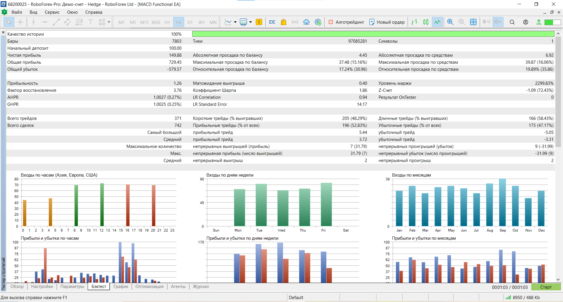 Настройки индикатора MACD - Fast_EMA = 12, Slow_EMA = 26, MACD_SMA = 9, MACD_Price = Close price, shift = 0 .