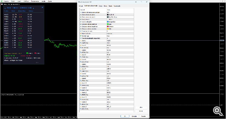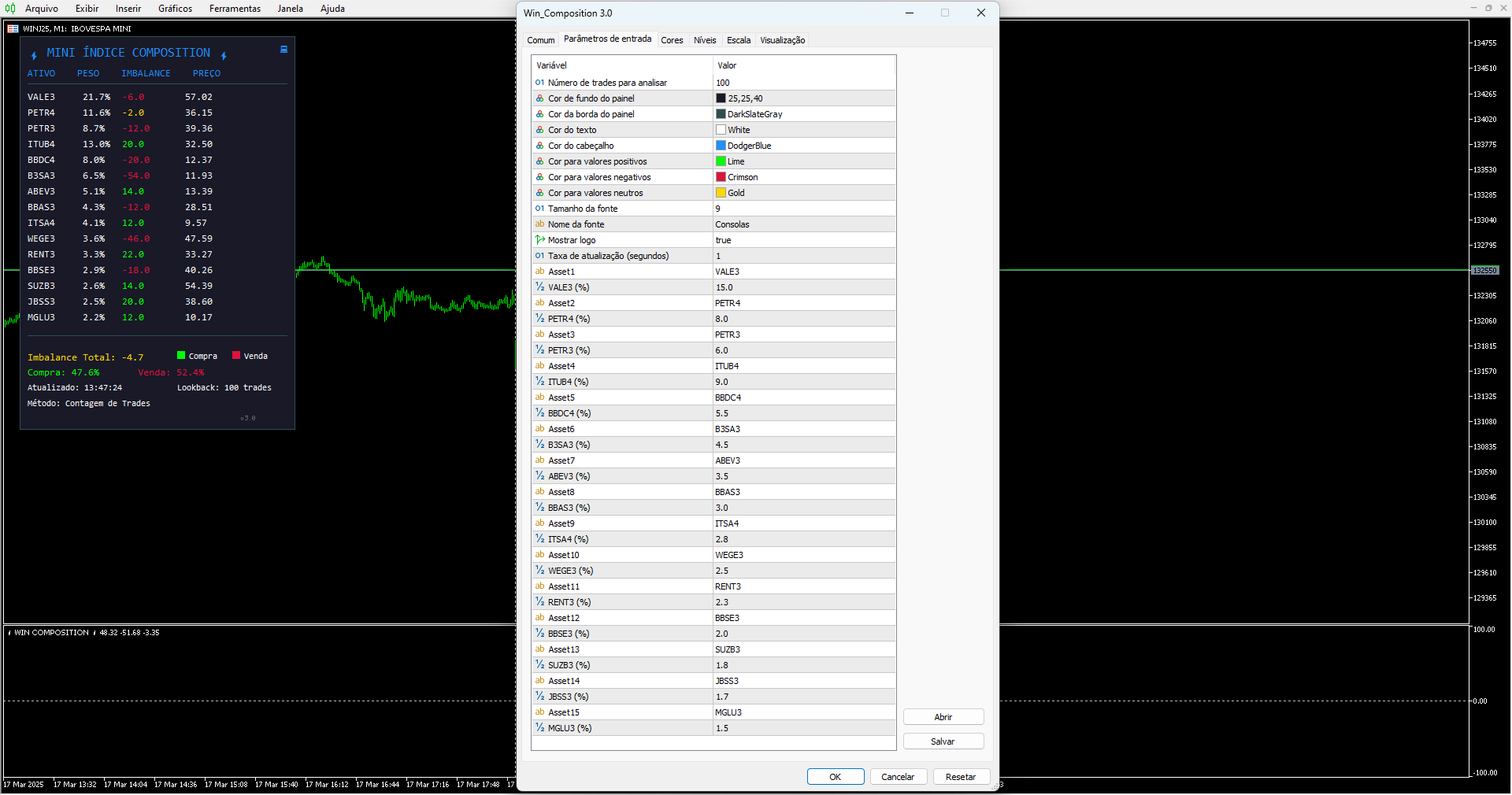 Preencha as ações no menu de input, pois estão em branco. Não altere os valores dos pesos. Durante o horário das 10h às 12h, período de maior influência das ações no mini índice, o código antecipa os movimentos com base no fluxo das ações.