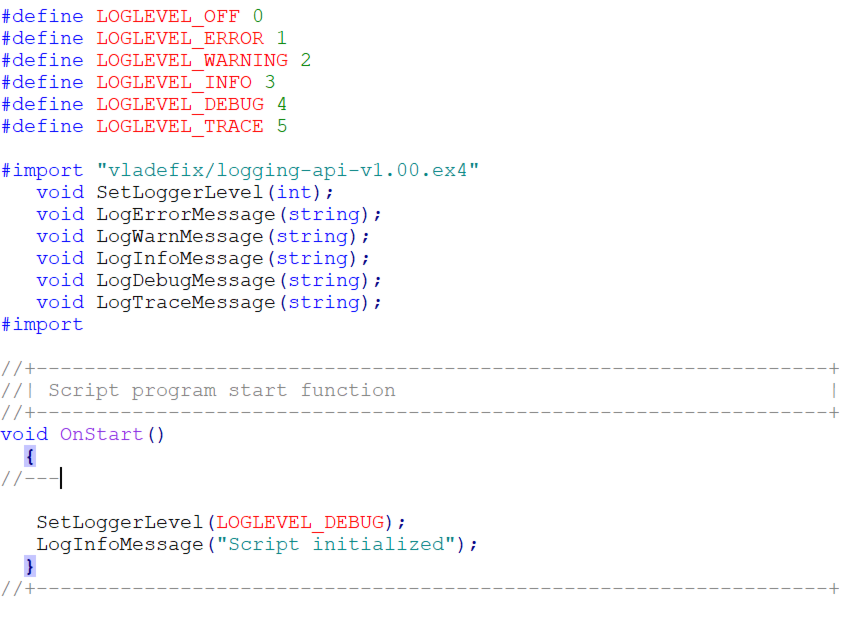 #define LOGLEVEL_OFF 0 #define LOGLEVEL_ERROR 1 #define LOGLEVEL_WARNING 2 #define LOGLEVEL_INFO 3 #define LOGLEVEL_DEBUG 4 #define LOGLEVEL_TRACE 5 // Einfügen des API-Headers für die Protokollierung #import "vladefix/logging-api-v1.00.ex4" void SetLoggerLevel(int); void LogErrorMessage(string); void LogWarnMessage(string); void LogInfoMessage(string); void LogDebugMessage(string); void LogTraceMessage(string); #import //------------------------------------------------------- // Initialisierungsfunktion (OnInit) //------------------------------------------------------- int OnInit() { /* Setzen Sie die globale Protokollierungsstufe mit einer der vordefinierten Protokollierungsstufen: LOGLEVEL_OFF -> Überhaupt keine Protokollierung LOGLEVEL_ERROR -> Nur Fehlermeldungen LOGLEVEL_WARNING -> Fehler und Warnungen LOGLEVEL_INFO -> Informationsmeldungen und höher LOGLEVEL_DEBUG-> Debug-Meldungen (und darüber hinaus) LOGLEVEL_TRACE -> Alle Logging-Meldungen */ SetLoggerLevel(LOGLEVEL_INFO); // Für dieses Beispiel protokollieren wir Info und darüber. return INIT_SUCCEEDED; } //------------------------------------------------------- // Haupthandler für das Tick-Ereignis //------------------------------------------------------- void OnTick() { // Protokollieren Sie bei jedem Ticken eine Informationsmeldung. LogInfoMessage("OnTick event triggered."); }