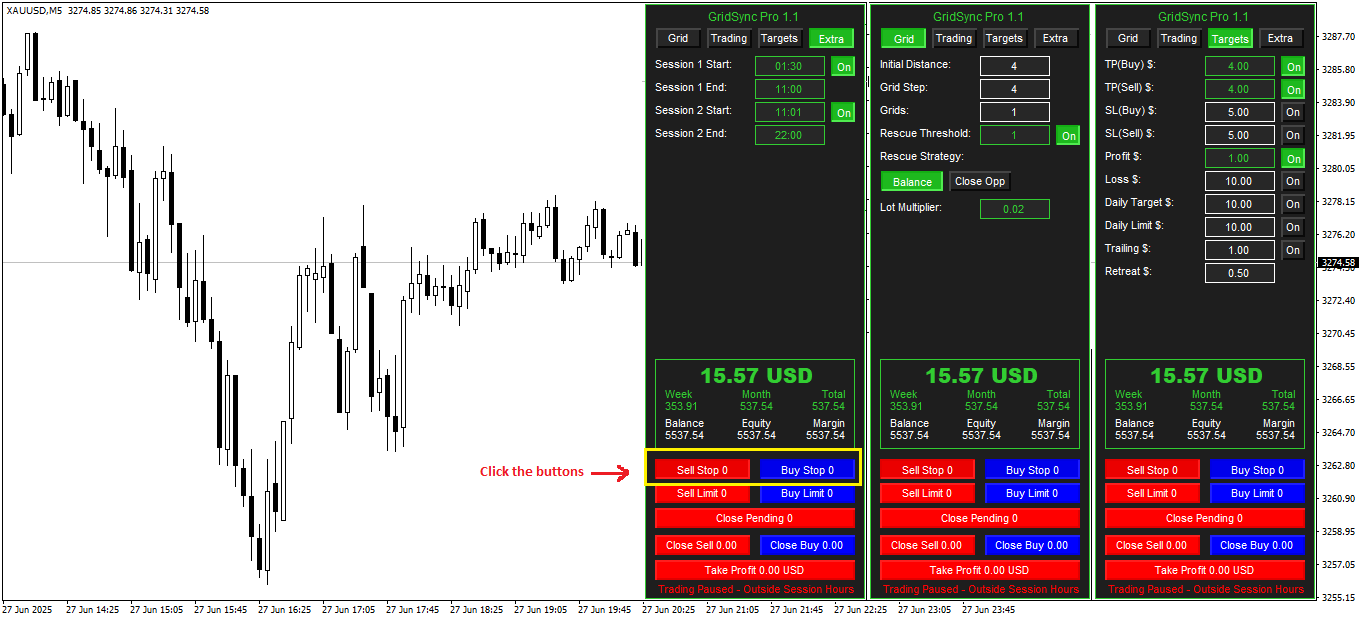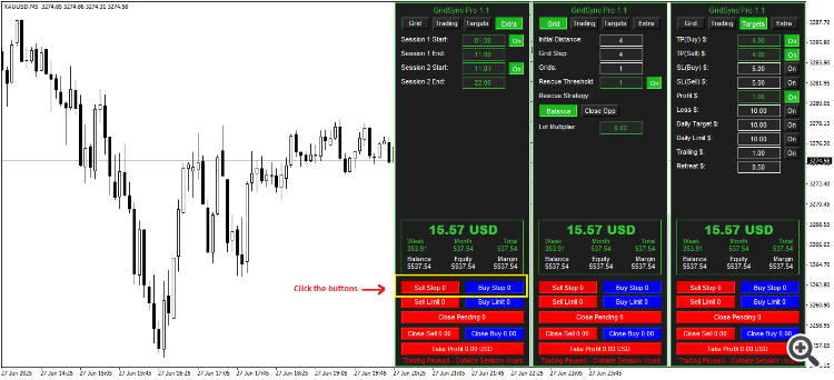 Answer: Grid Sync Pro is built as a fully automated grid trading system that includes manual dashboard buttons for users who want extra control or flexibility. Once you click the BuyStop/SellStop or BuyLimit/SellLimit buttons in the dashboard, the EA saves those settings permanently and runs automatically from that point forward, you don't need to keep manually clicking them every time.