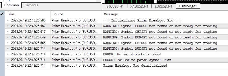 loaded prism ea onto eur usd H4 chart and used the set file on mql5. the ea is removed from chart almost immediately, experts tab shows errors about symbols. my symbols do not have a suffix or prefix. errors as per attachment