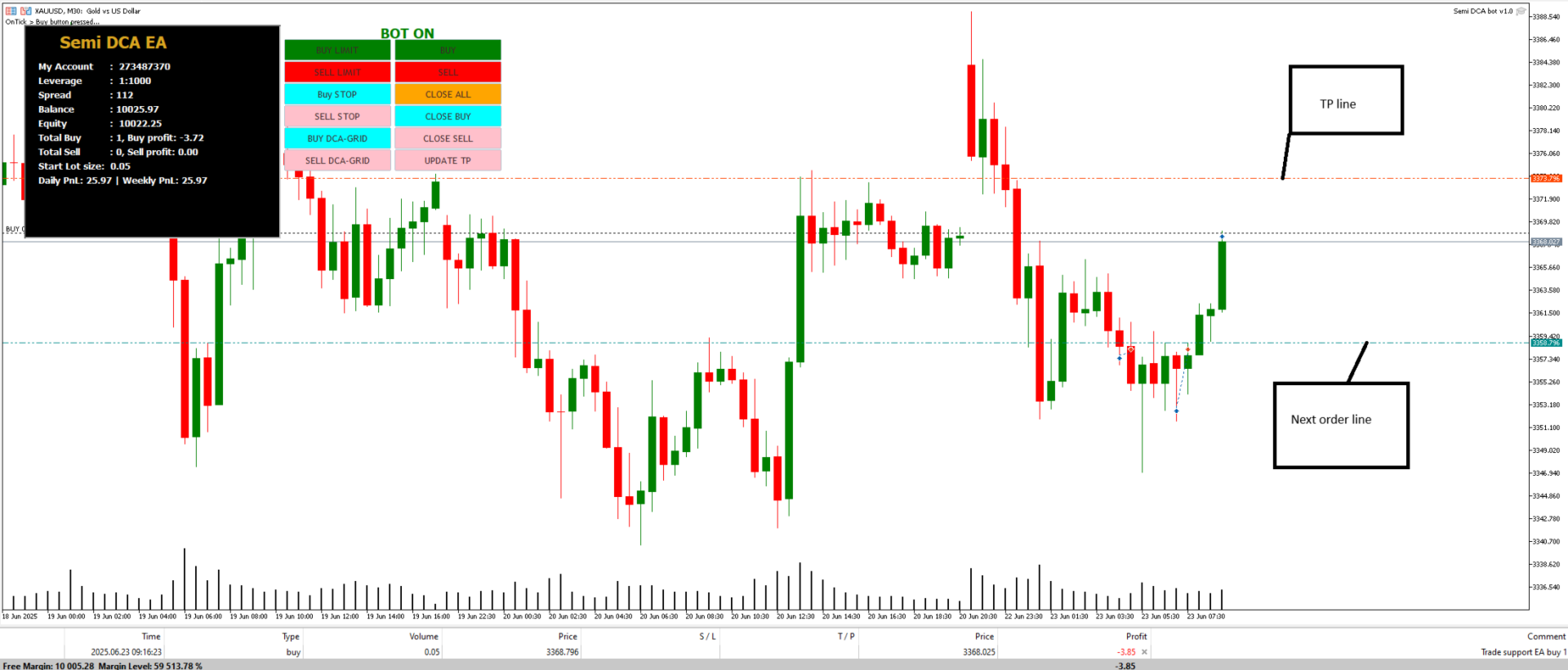 Sie können den ersten Auftrag auf Ihrem Telefon oder MT5-Terminal auf Ihrem Computer eingeben und er nimmt automatisch den Gewinn oder DCA Ihre Aufträge.