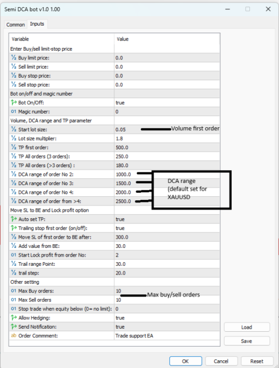 * Max/buy sell orders: ist die Gesamtzahl der Kauf/Verkaufsaufträge, die der EA platzieren darf.