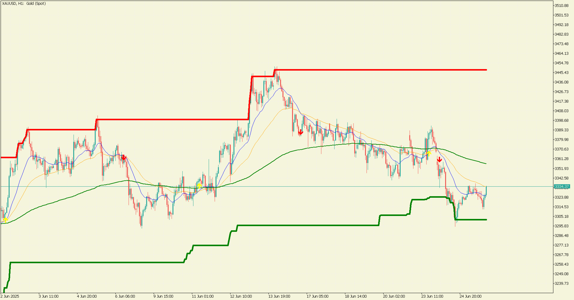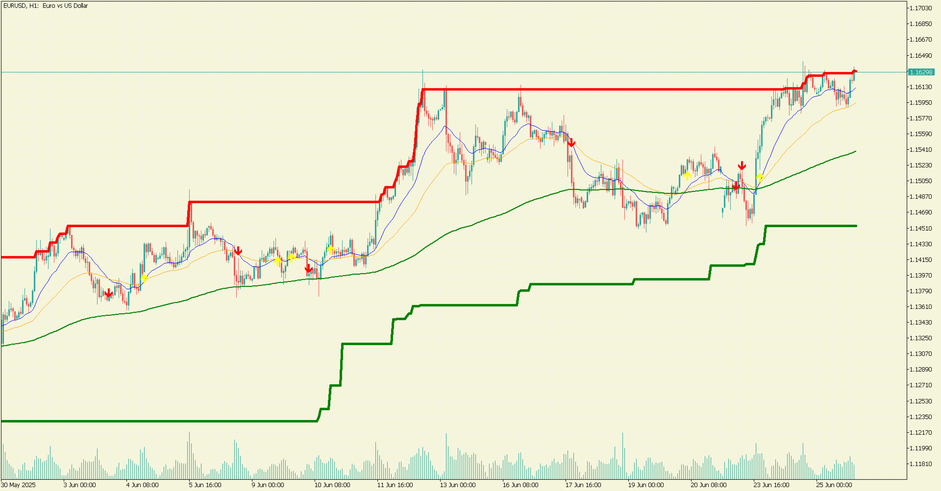 Höchste und niedrigste Niveaus: Linien (rot für den höchsten, grün für den niedrigsten Wert) zeigen die höchsten und niedrigsten Schlusskurse über einen bestimmten Zeitraum (Standard: 200 Balken) und helfen, wichtige Unterstützungs- und Widerstandsniveaus zu identifizieren.